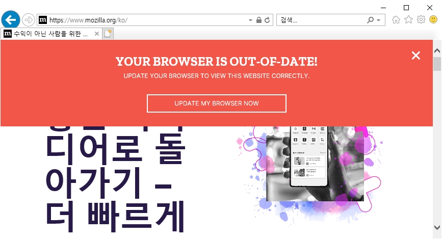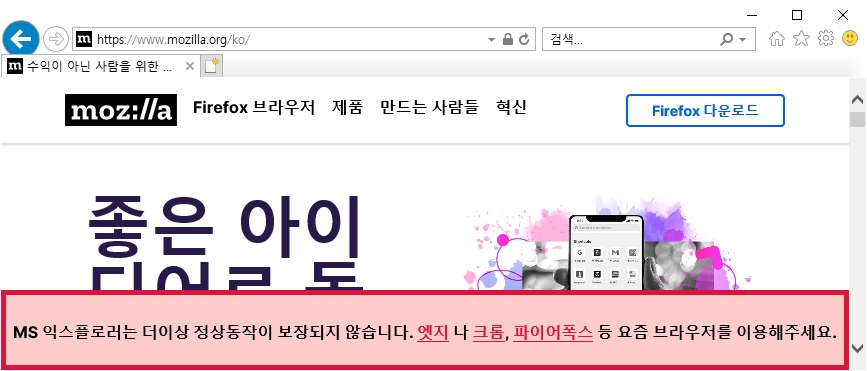 - 위와 같이 html 끝나는 곳 /body 앞쪽에 한 줄 추가하면 IE를 감지하여 스크린샷 처럼 안내가 추가됩니다.
