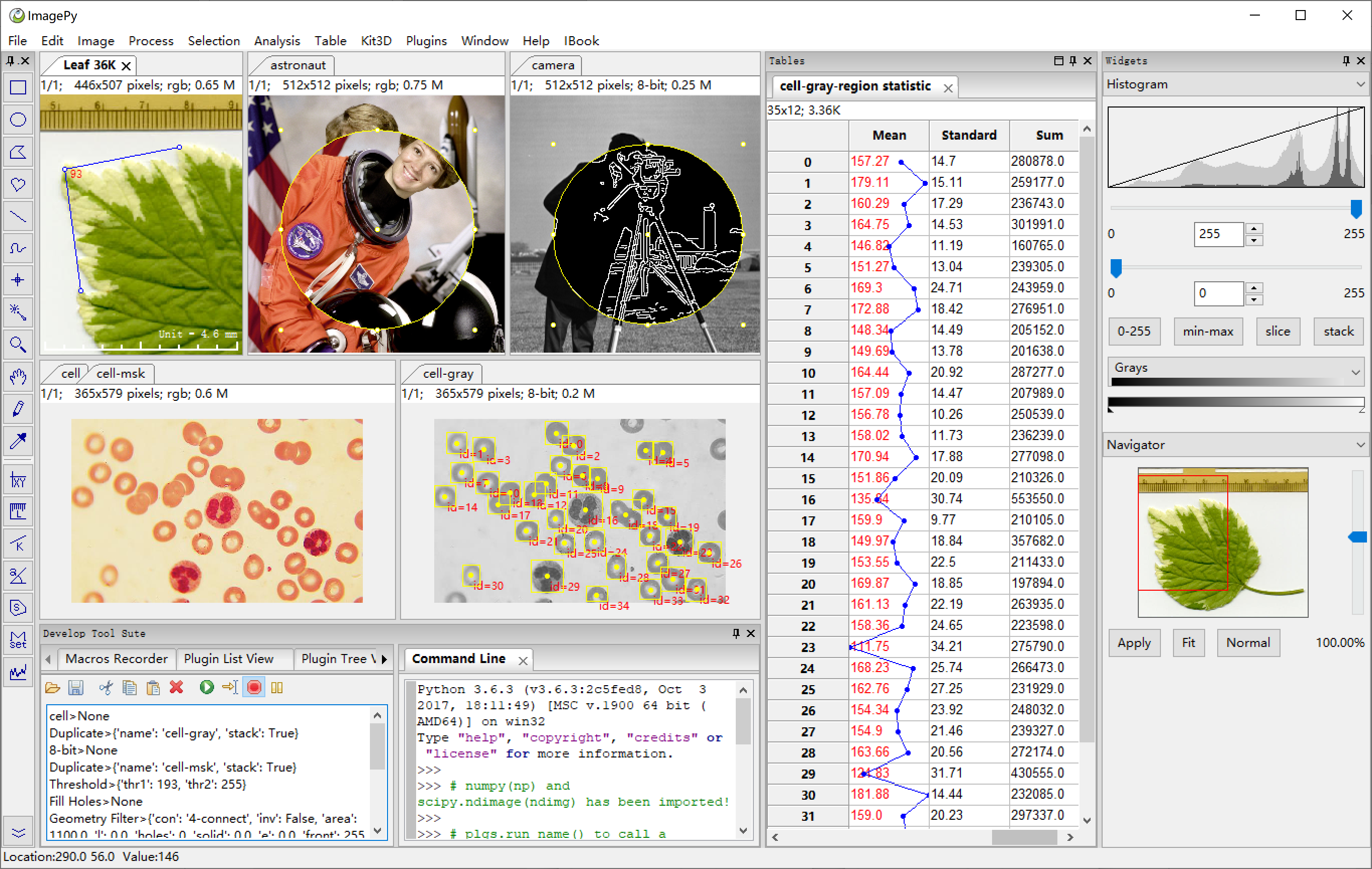 ImagePy is an open source image processing framework written in Python. Its UI interface, image data structure and table data structure are wxpython-based, Numpy-based and pandas-based respectively. Furthermore, it supports any plug-in based on Numpy and pandas, which can talk easily between scipy.ndimage, scikit-image, simpleitk, opencv and other image processing libraries.