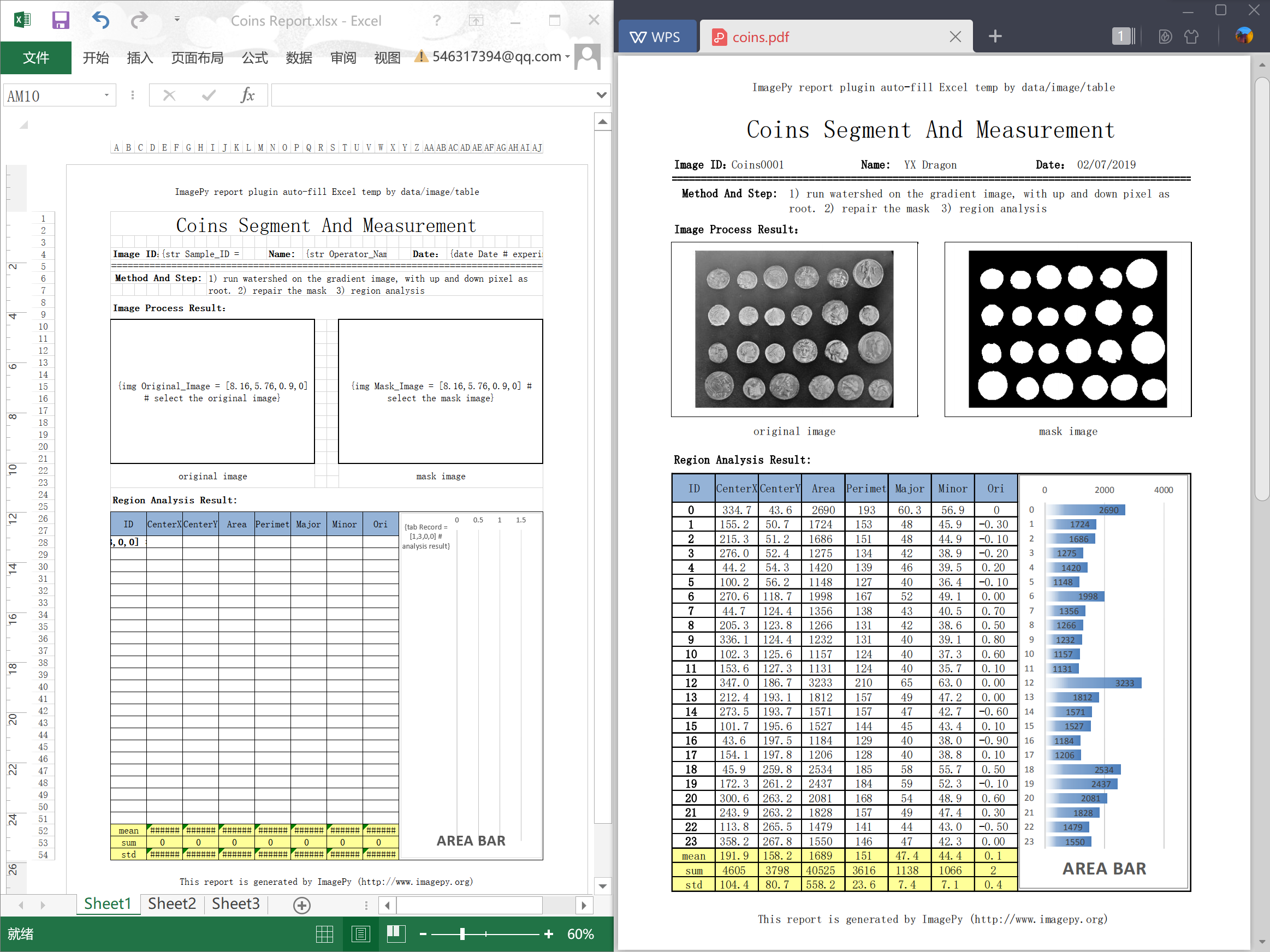 ...Sometimes we need to make a report to print or generate a PDF document. ImagePy can generate report from a xlsx template. We just need put specific mark in some cells, ImagePy will parse the template and generate a parameter dialog, then we can input some information, or give image/table in, the report will be generated! more about how to make template please see here.