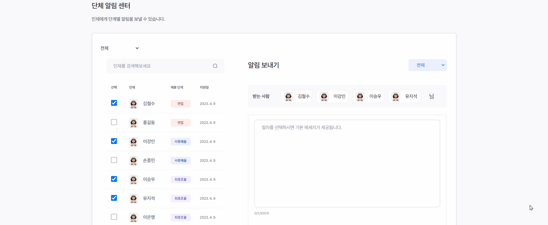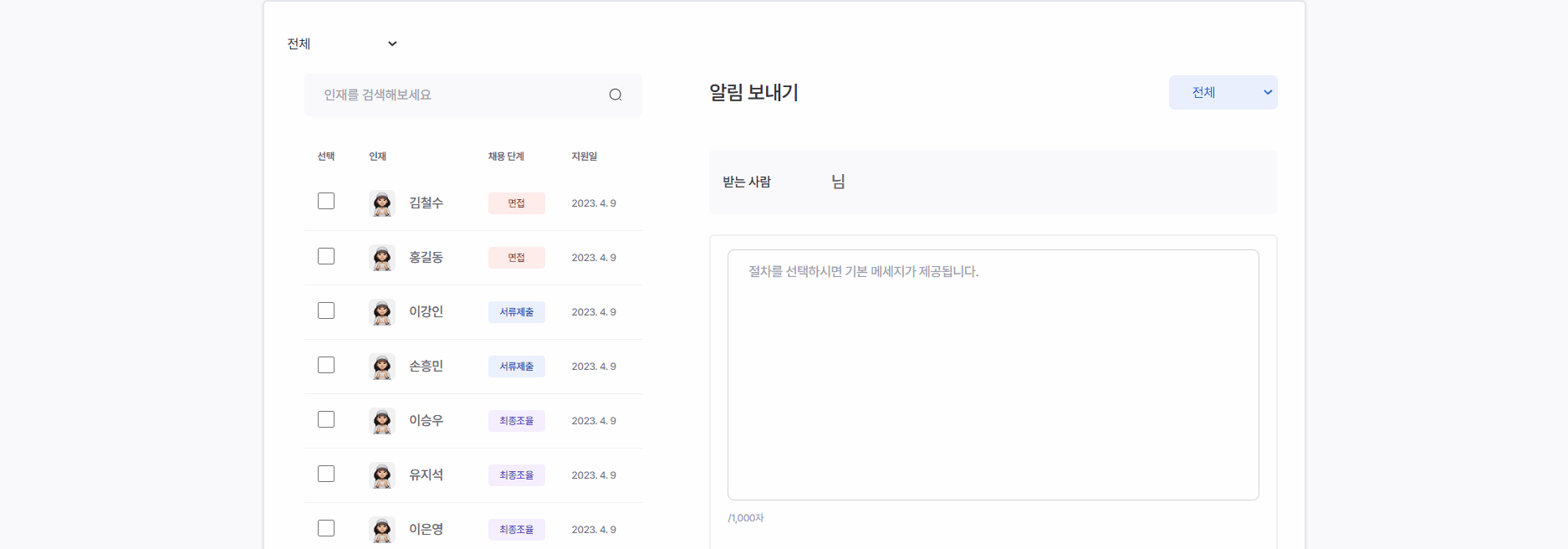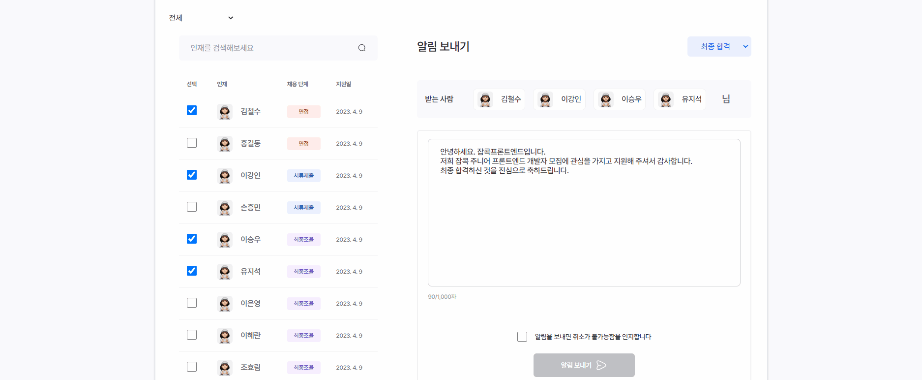 - 인재 선택 및 메세지 전송