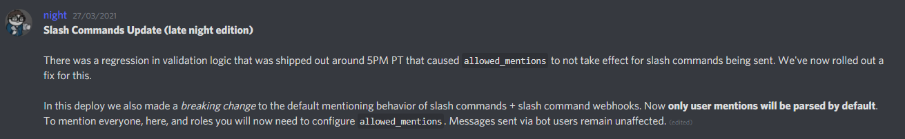 What I'm getting from this is that permissions were escalated to prevent the worst-case scenario of potential ping abuse; a problem that is easily preventable by being wary of what bots you add to the server. I get the intentions behind the change but it seems like it's an extreme stopgap to an insignificant problem. There are no security vulnerabilities (right?) that this change fixes. Removing abilities to ping roles for interaction responses to prevent ping abuse from a few bad actors (which can be fixed by simply removing the bot from the server and/or removing slash command usage permissions from the server members abusing the feature) handicaps an integral part of interactions for certain bot genres. I still believe the change is unnecessary; if there is a bad actor, the servers themselves can handle the issue. If it was an unwanted feature, the developers can disable it (which it was by default, anyway) in their own code. Reverting the change would definitely bring back that freedom. |