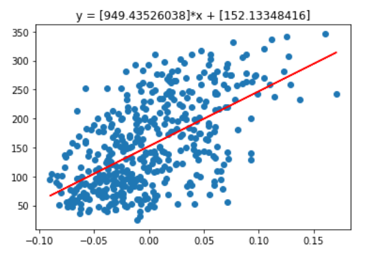 저는 그 중에서 442명의 당뇨병 환자들의 데이터를 가지고 왔습니다. 그 밑에 matplotlib라이브러리로 선형회귀를 그려줄 것입니다.