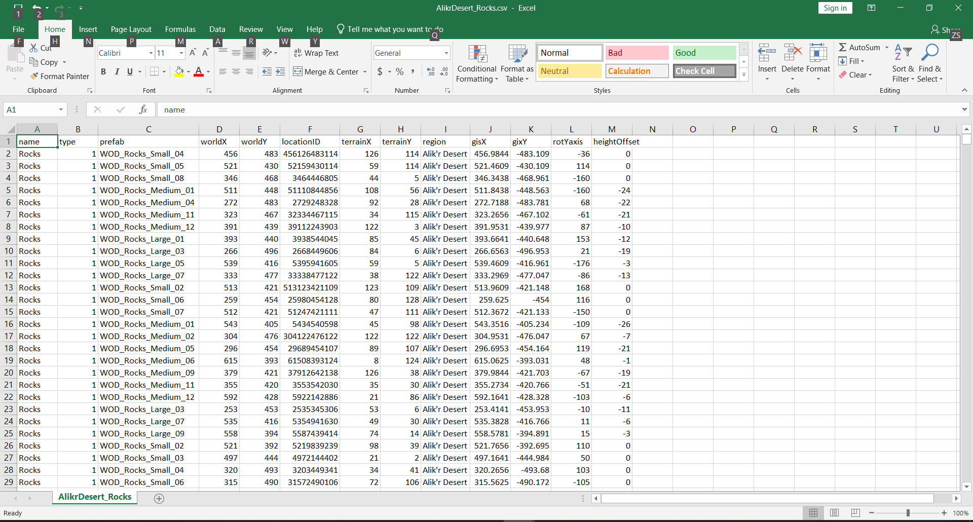 Copy your random points to the Prefab Placer layer, and export to a CSV file. Open the CSV in a spreadsheet program. We can name all 8,000 rows "Rocks," and as we don't need smoothed terrain for rocks, we can set all the types to 1. The prefab column will take a bit more thought: after all, it would be a bit strange if we were to just see 20,000 instances of the same rock in the Alik'r Desert. You can make a rock prefab mix using simple spreadsheet tricks. Remember that these randomly generated rocks are in totally random order, so this strategy will have the rock types nice and mixed up. Save the CSV file.