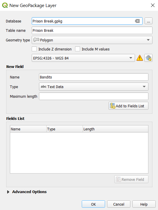 The first thing to do here is to draw a polygon around Arkmoth End. To do this, we'll need to create a new polygon layer. Select Layers -> New Geopackage Layer... from the menu. Set the layer to have a Polygon geometry type, name it whatever you'd like, and hit OK.