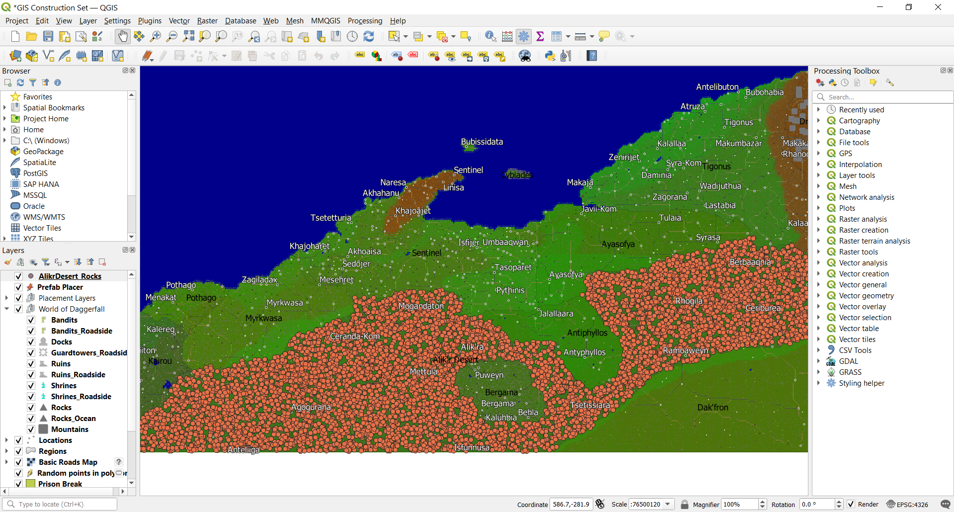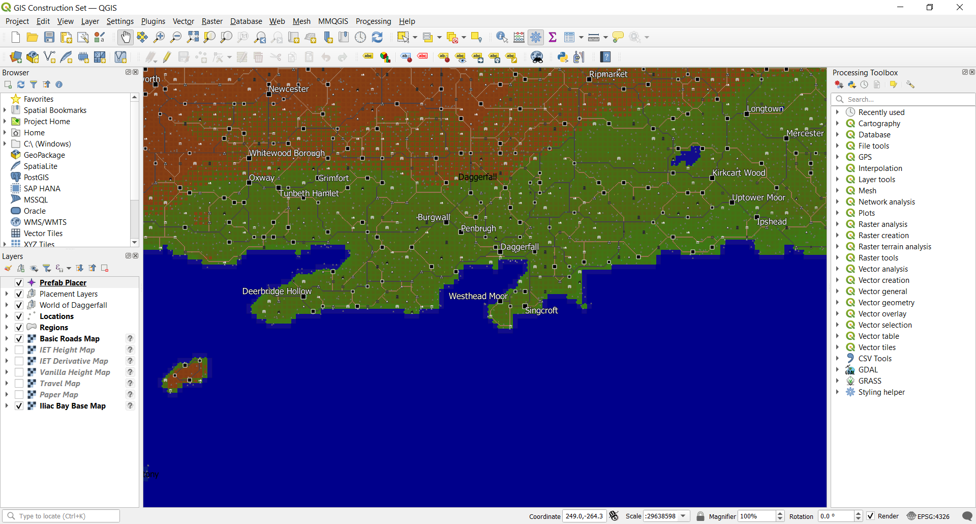 This post presents a QGIS (www.qgis.org) project designed to help modders place location prefabs that load into DF Unity with Kamer's World of Daggerfall. Using the Construction Set, modders can individually hand-place prefabs with considerable precision, or they can use QGIS's random and algorithmic point placement functions to place prefabs by the dozens, hundreds, thousands, or tens of thousands.