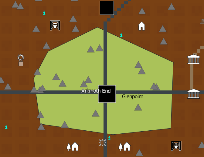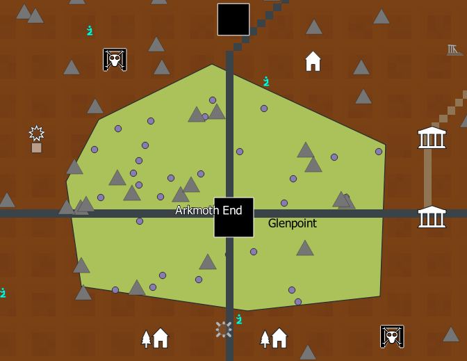 Let's suppose that we decide there's been a prison break in Arkmoth End, and now the hills are full of bandits. Let's randomly place 30 bandit camps in a polygon around Arkmoth End.