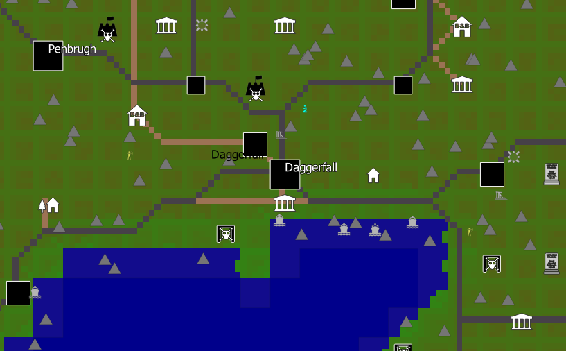 - World of Daggerfall: These maps show where bandits, docks, guardtowers, ruins, shrines, rocks, and mountains are placed in the World of Daggerfall mod.