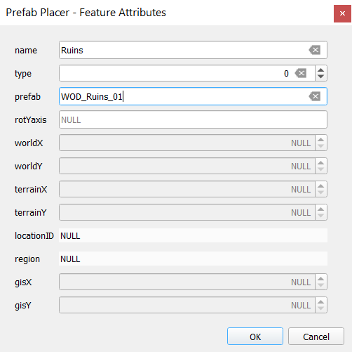 - Prefab Placer: All points created in or copied to this layer will have their locational fields autopopulated with values that can be read directly by the LocationLoader or World of Daggerfall mods. This includes the worldX, worldY, terrainX, and terrainY coordinates. The layer also calculates a unique locationID for every possible point by concatenating its coordinate values. You will need to enter in only name (which does not need to be unique), prefab, and type (more on this below). These can be entered either when adding points individually, in QGIS's attribute table, or in a spreadsheet program after export.