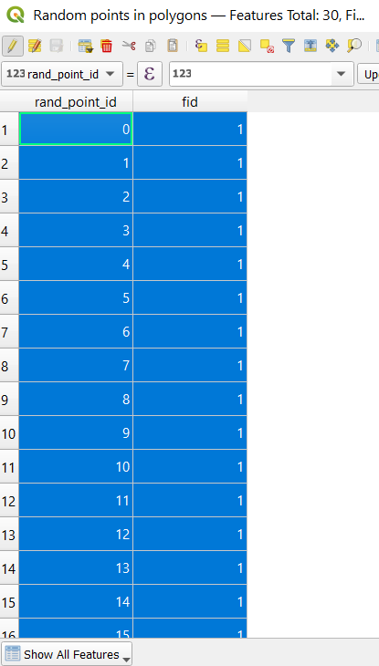 Your polygon will now be full of points, but all on a new layer called Random Points. Select this layer, hit Toggle Editing, right-click on it and open its Attribute Table, and select all the points by shift-clicking the numbers 1-30 on the left side.