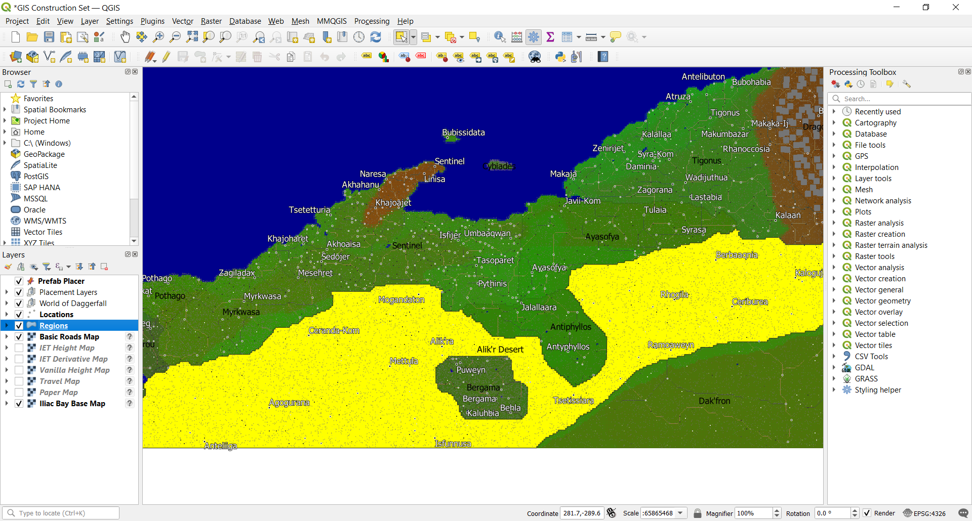 Daggerfall is really big. Far, far too big to work with conventional modding construction sets like those for Morrowind, Oblivion and Skyrim. Geographic Information Systems (GIS) tools, however, are perfect for working at such large scale.