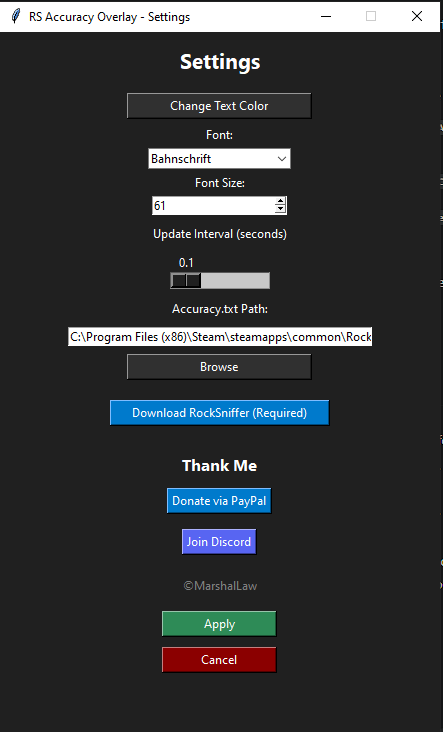 Created by MarshalLaw, RS Accuracy Overlay gives Rocksmith players a minimal, transparent display of their current accuracy in real time — perfect for streamers, practice sessions, or anyone who wants live feedback without opening extra windows.