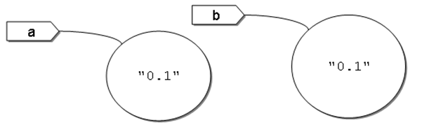 - 程式中使用a == b,就是在問,a牌子綁的物件是否就是b牌子綁的物件?答案「不是」,也就是false的結果,程式中使用a.equals(b),就是在問,a牌子綁的物件與b牌子綁的物件,實際上內含值是否相同,因為a與b綁的物件,內含值都是"0.1"代表的數值,答案「是」,也就是true的結果。