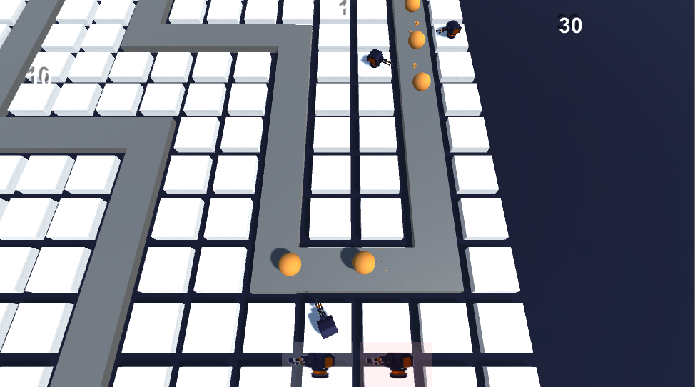 ##Gameplay There is no win condition, the player can't win. Enemies will continue to spawn until they have reached the end enough times, at which point the level will reload and begin again. There are 2 choices of turrets currently, a basic version and extended reach. Like any good TD, the the turrets cost money which is earned by killing enemies. I haven't quite balanced it out yet. Select a turret from the bottom toolbar, and then select a platform to build.