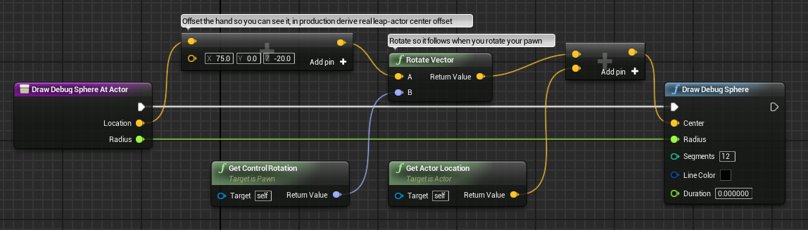 What this setup gives you in flexibility is that you have many entry points from which to modify any aspect of the rigging. E.g. If you wish to change post process material being used you would change it in the PPChanger blueprint while still retaining every other functionality. Or if you want to adjust the default mode offset (where your leap is in relation to you when place on the table) you would modify the LeapAnimBodyConnector component which specifies its location. If you want to use your own skeletal mesh, simply replace the mesh, but retain the animation blueprint (use animation retargeting if you're using different skeletons). In fact the rigging setup doesn't even need the leap motion to work, any input which would change the AnimBody skeleton to whatever pose you wish to attain would have the same rigged behavior. The setup is the beginning part of a BodyInput plugin which will support a similar setup for various VR inputs in the future.