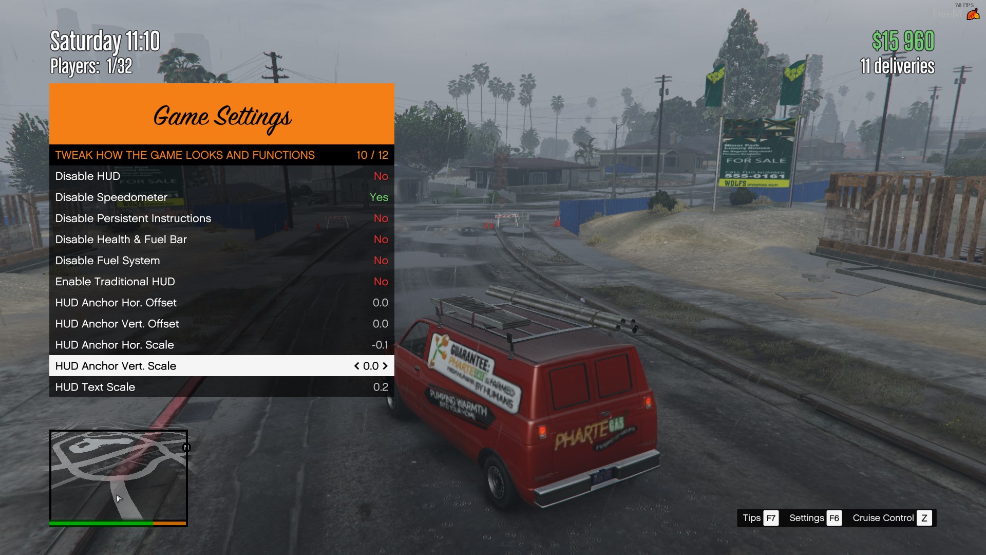 A settings menu is available, this lets you adjust the HUD, such as the Minimap Anchor (and everything that comes with it). It also allows game rules to be changed, such as the fuel system.