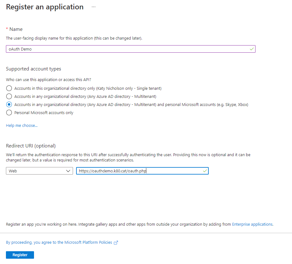To create the App Registration, go to Azure AD > App registrations https://portal.azure.com/#blade/Microsoft_AAD_IAM/ActiveDirectoryMenuBlade/RegisteredApps and click New registration. Fill out your site display name, select the account types, then enter the Redirect URI which will be https://your.domain.name/oauth.php. Make sure that you put https://your.domain.name (with no trailing slash) into _URL within config.inc. Click Register once done.