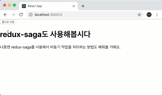 지금은 단순히 다른 작업을 하지 않고 바로 홈으로 이동하게끔 했지만, 실제 프로젝트에서는 getState() 를 사용하여 현재 리덕스 스토어의 상태를 확인하여 조건부로 이동을 하거나, 특정 API를 호출하여 성공했을 시에만 이동을 하는 형식으로 구현을 할 수 있답니다.