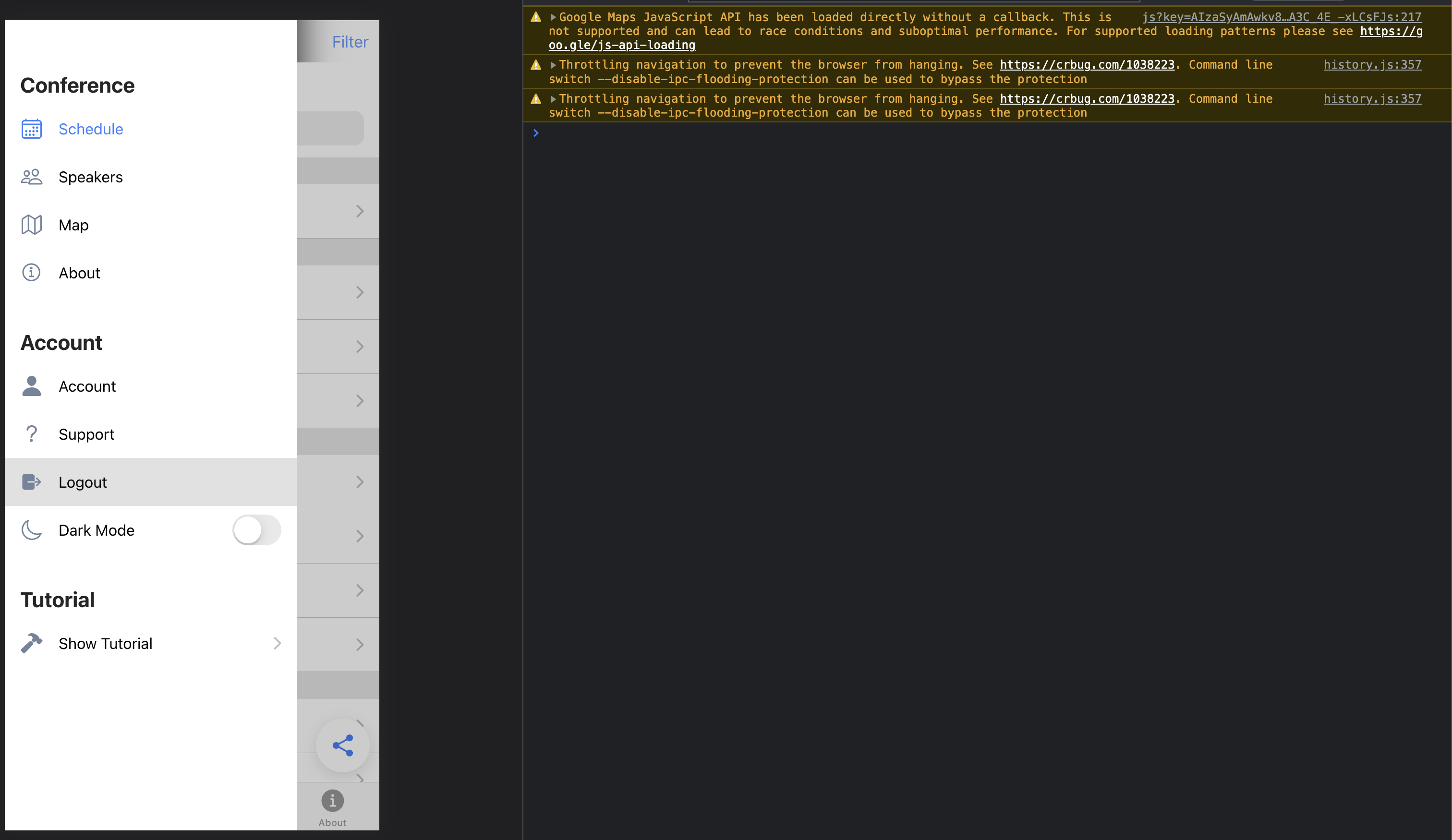 The app is continuously freezing when I click on Logout: