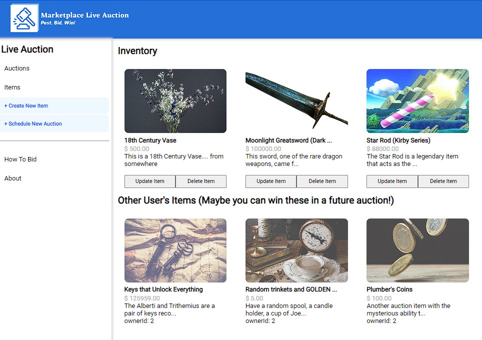 - Users can create Auctions, with items they create/ win