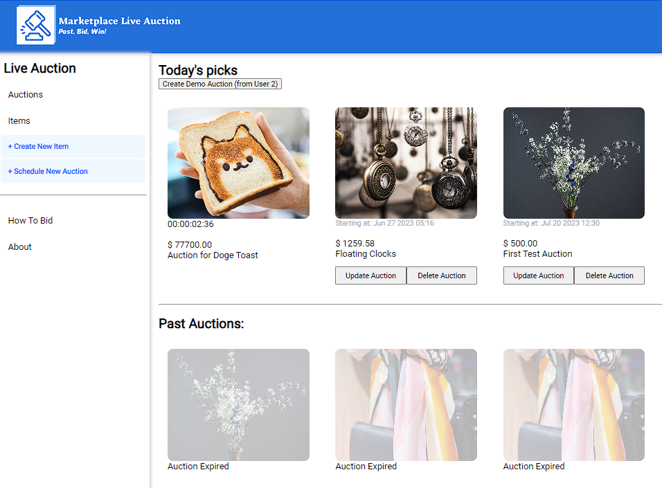 - Users can update/delete their own Auctions, up to five minutes before the auction begins