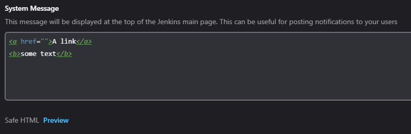 .Also, the description field does not show any information about the markup formatter, nor does it support syntax highlighting like seen on other Jenkins' forms.
