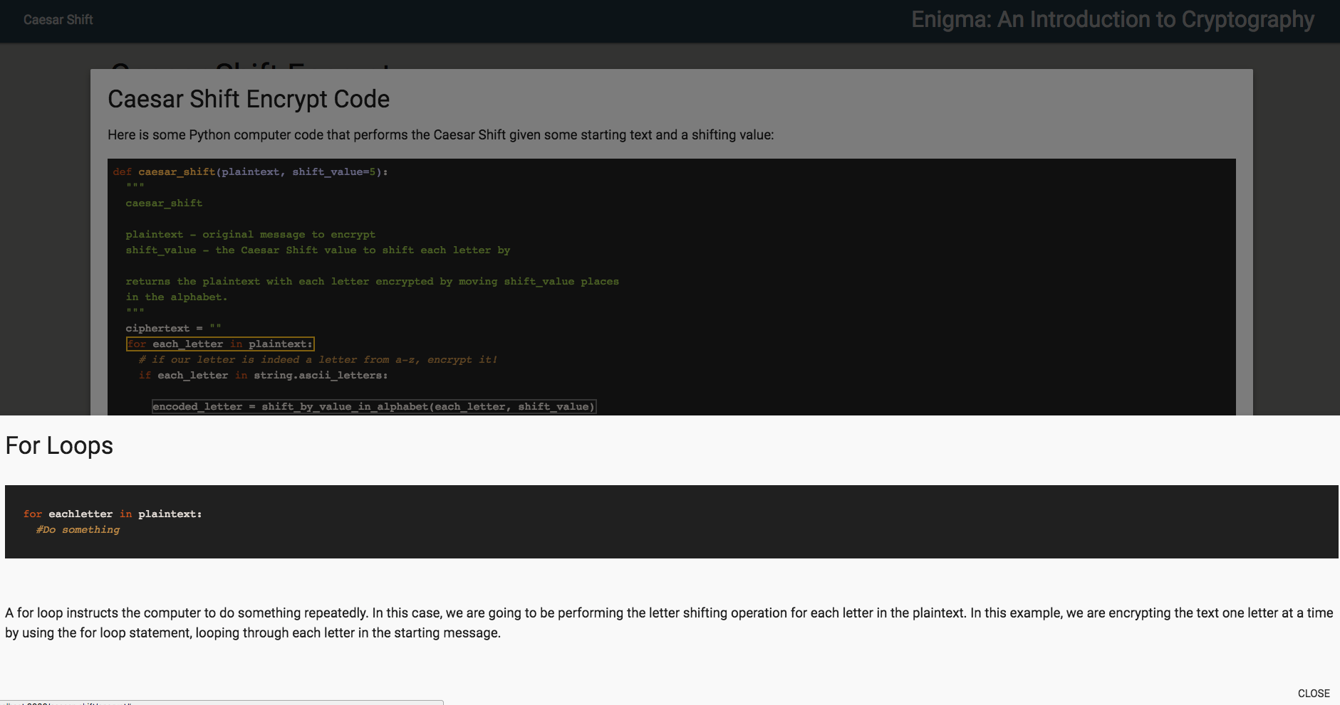 In addition to teaching students about using different crytographic algorithms, the unit features an (optional) look into runnable code detailing the algorithm. The code is also well-documented and abstracted in a way where it is digestable.
