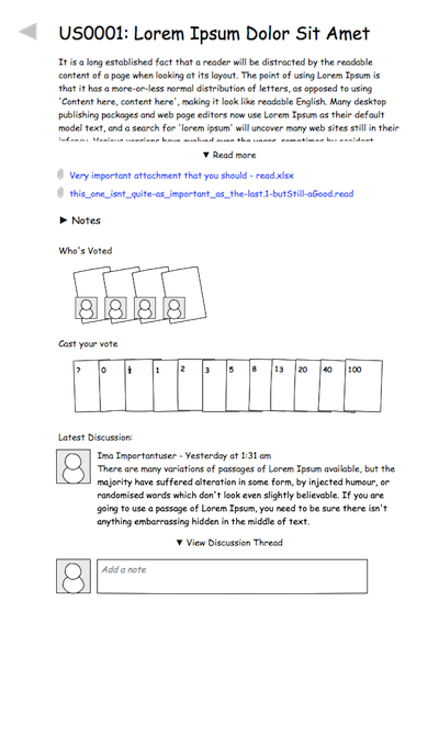 Team members viewing this app will first see a list of stories queued up for review. Clicking on a story's name will display its description, notes, and attachments as well as the stream of messages in its discussion thread. Team members will be able to create new messages and cast their vote for the story's size by selecting from a deck of planning poker cards. The names and profile pictures of other team members who have already voted on the selected story will be displayed along with a face-down card. Using specially-coded discussion-thread messages, the app will allow team members to size stories in their own time, notifying users that they have completed their review without revealing their estimate to the rest of the team.