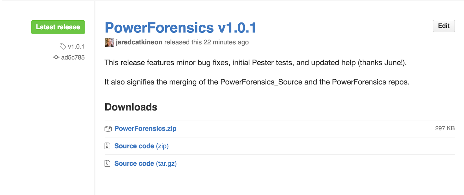 To begin open an internet browser and navigate to the main PowerForensics github page. Once on this page you will need to find the latest release, download PowerForensics.zip, and extract the module into your modules directory.