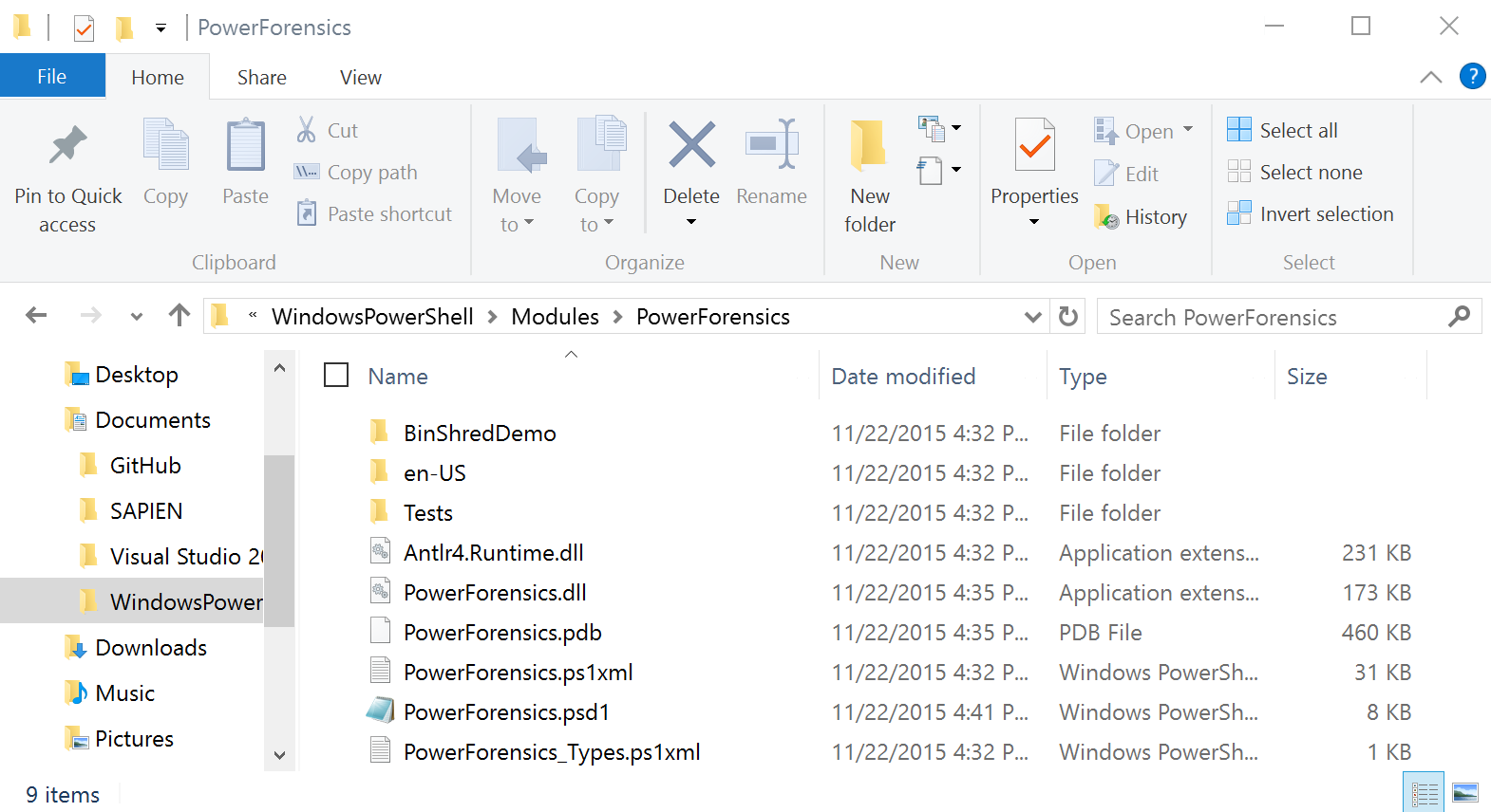 Open your Modules directory and create a new folder called PowerForensics. You can use this script to open the correct folder effortlessly: