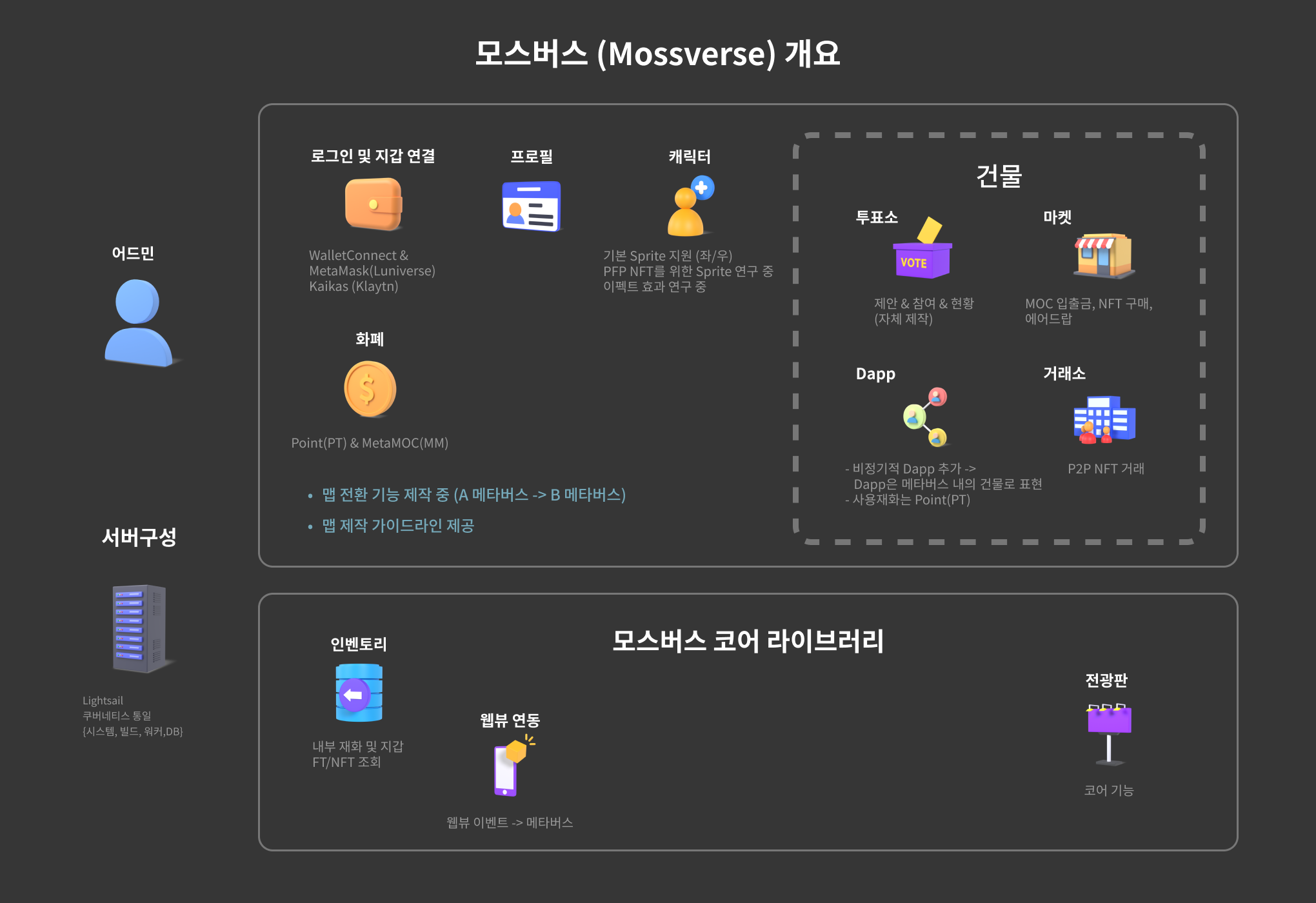 - The goal is to develop and supply various contents as open source in Mossverse through the Mossverse Hackathon. Hackathons are held on the public GitHub Repository, where anyone can propose ideas and participate in development. [GitHub - mossland/Hackathon] (https://github.com/mossland/Hackathon)