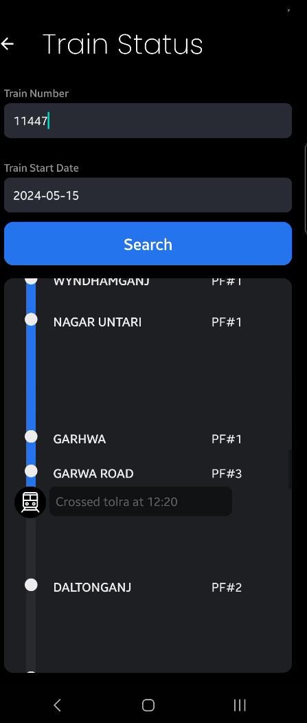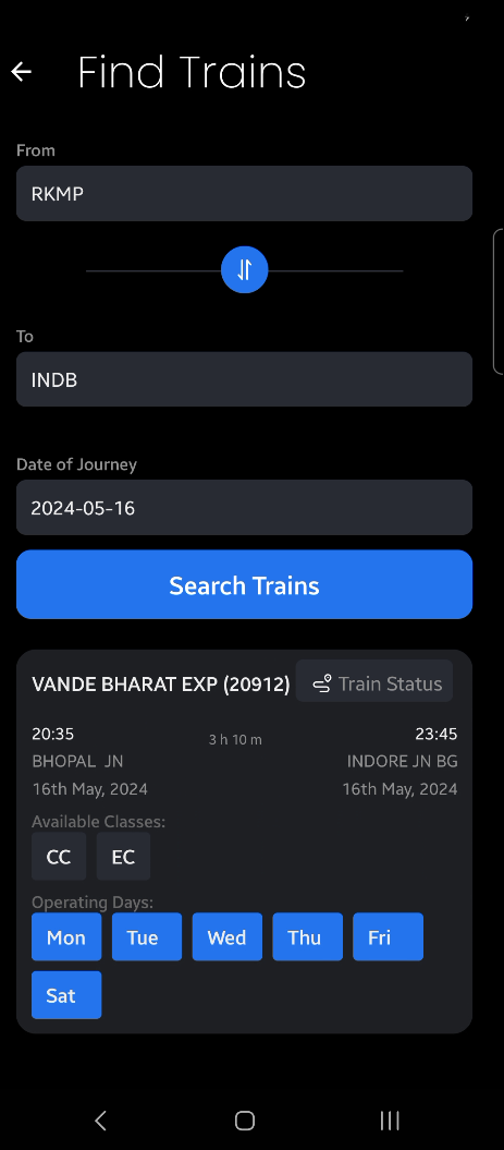 Users can search for trains between two stations by providing the source and destination station codes. The application fetches relevant train information from the database and displays it to the user, like the train name, date and time of arrival, departure at the source station and at the destination station. User can also press a live status button to track the current location of that train.