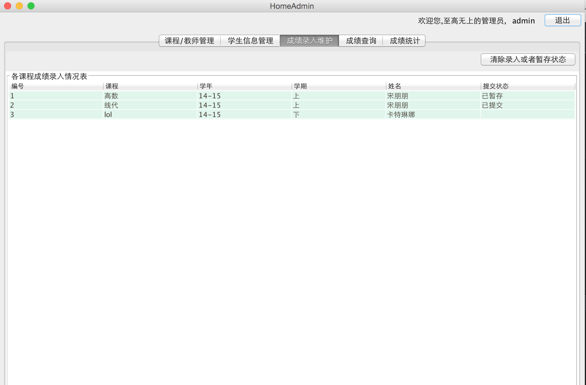 - 成绩维护:教师在提交前,可以修改已录入或暂存的学生成绩;但提交后,则只能查询不能再进行任何修改;教学管理员可以清除教师已提交的成绩。