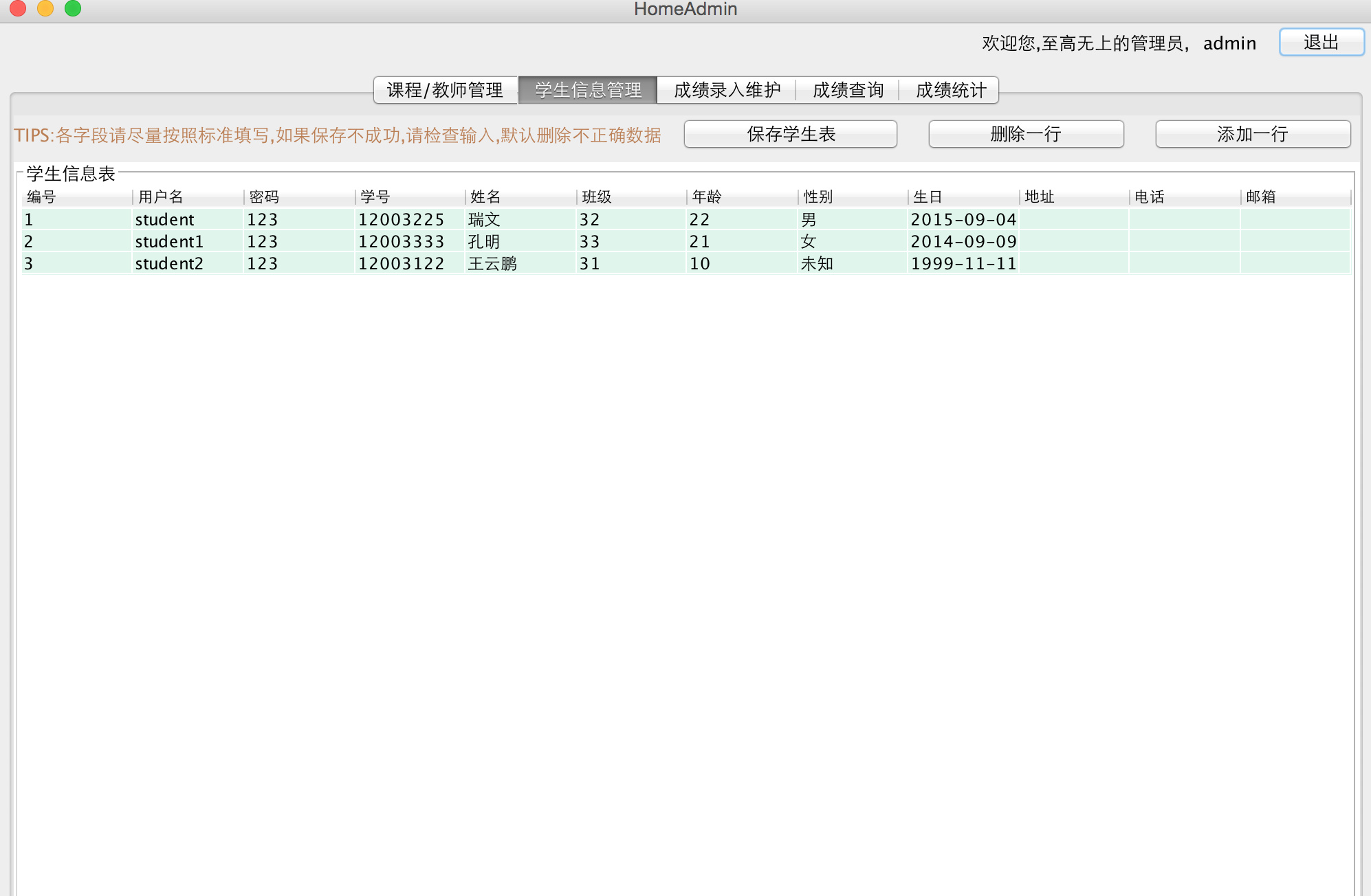 - 用户登录:对用户身份进行认证 用户信息管理:对学生、教师和管理员等各类用户的基本信息进行管理,例如:学生信息包括:学号,姓名,年龄,性别,出生年月,地址,电话,E-mail等。