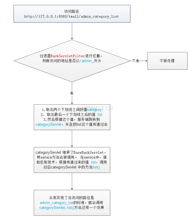 这里以分类进行举例: 分类管理需要:增加,删除,编辑,修改,查询 5 个功能,按照传统的在 web.xml 中配置 Servlet 的思路,那么就需要 5 个 Servlet 类,而后台需要做分类,产品,属性,产品图,用户,订单 6 中管理,就一共需要30 个 Servlet,还要配置 web.xml 就会变得很乱。 解决的方法是把所有分类操作放在同一个 Servlet ,对应不同的方法。 让我们来分析,如何做到访问 admin_category_list 的时候,CategoryServlet 的 list() 方法会被调用: