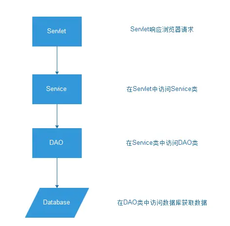 作为J2EE web 应用,一般会按照如图所示的设计流程进行 Servlet -> Service(业务类) -> DAO -> database