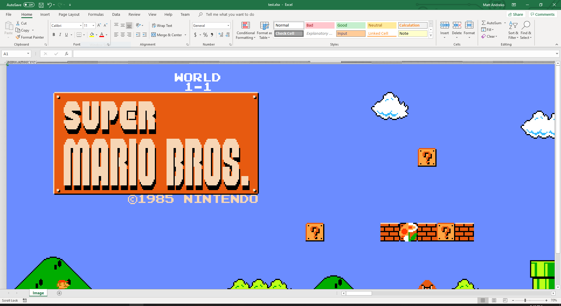 ImageToExcel This application simply converts images to Excel files, with each pixel of the image being a cell in the worksheet. Usage: ImageToExcel.exe image_filename output_excel_filename [resize_percentage]