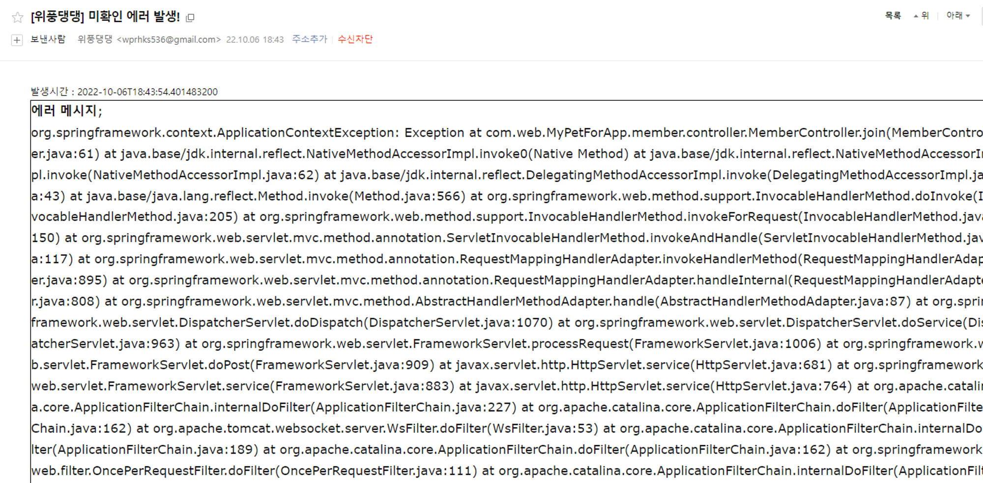 - 백엔드 서버에서 미리 핸들링되도록 설정하지 않은 에러가 발생 시, 등록한 개발자들의 이메일로 해당 에러의 내용을 메일 발송합니다.