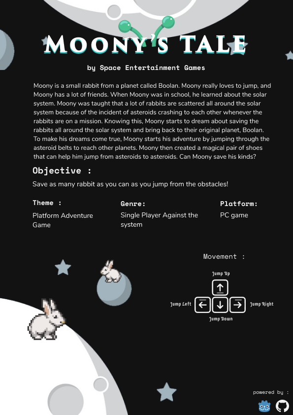 Moony is a small rabbit from a planet called Boolan. Moony really loves to jump, and Moony has a lot of friends. When Moony was in school, he learned about the solar system. Moony was taught that a lot of rabbits are scattered all around the solar system because of the incident of asteroids crashing to each other whenever the rabbits are on a mission. Knowing this, Moony starts to dream about saving the rabbits all around the solar system and bring back to their original planet, Boolan. To make his dreams come true, Moony starts his adventure by jumping through the asteroid belts to reach other planets. Moony then created a magical pair of shoes that can help him jump from asteroids to asteroids. Can Moony save his kinds?