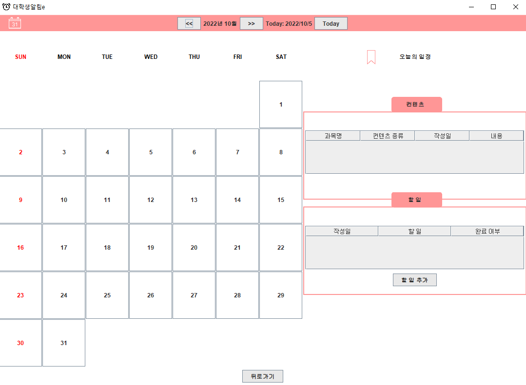 일정관리 시스템 프로젝트 학부시절 객체지향적으로 최대한 설계하려고 노력하였으며 java안에서 프론트엔드에서는 swing-Jframe을 사용했으며 백엔드에서는 디자인패턴을 이용하여 최대한 코드를 깔끔하고 리팩토링하기 용이하도록 설계하였습니다.