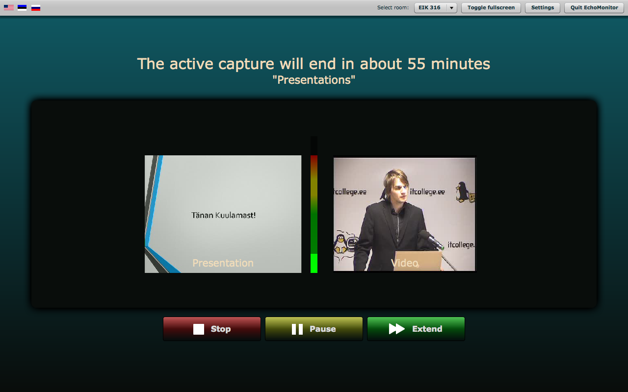 EchoMonitor has been built to be used as a separate easy-to-use one-screen application that gives lecturers all the information about next/current capture. EchoMonitor also has built in visual alerts to let the lecturer know of any possible errors with video, display or audio inputs.