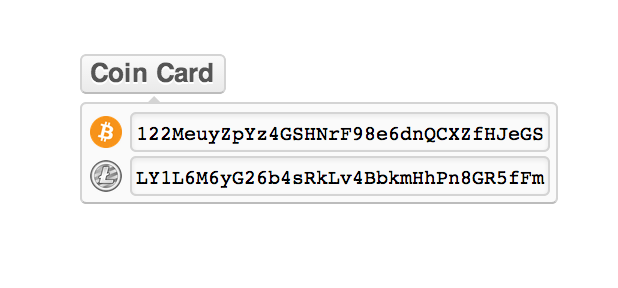 Coin Card Coin Card. Card for your coins, Card for your bitcoin. Usage <div class="coin-card" data-BTC="1PouzPJj5t3kCf5j7eYu3GXSE1PWuPkHQJ"></div> <script src="http://fangduncai.com/coin-card/src/widget.js"></script>