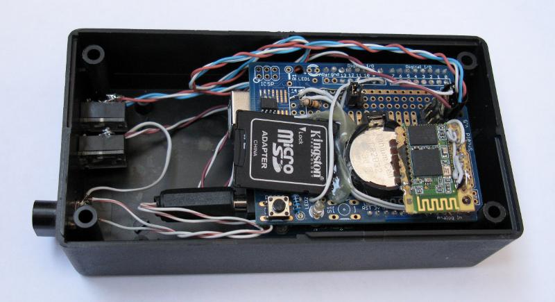 Logger with attached motion sensor, temperature sensor, push button and potentiometer: