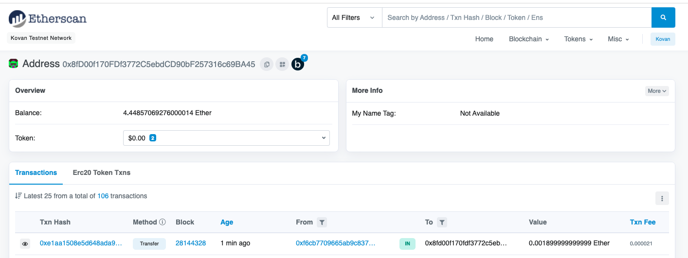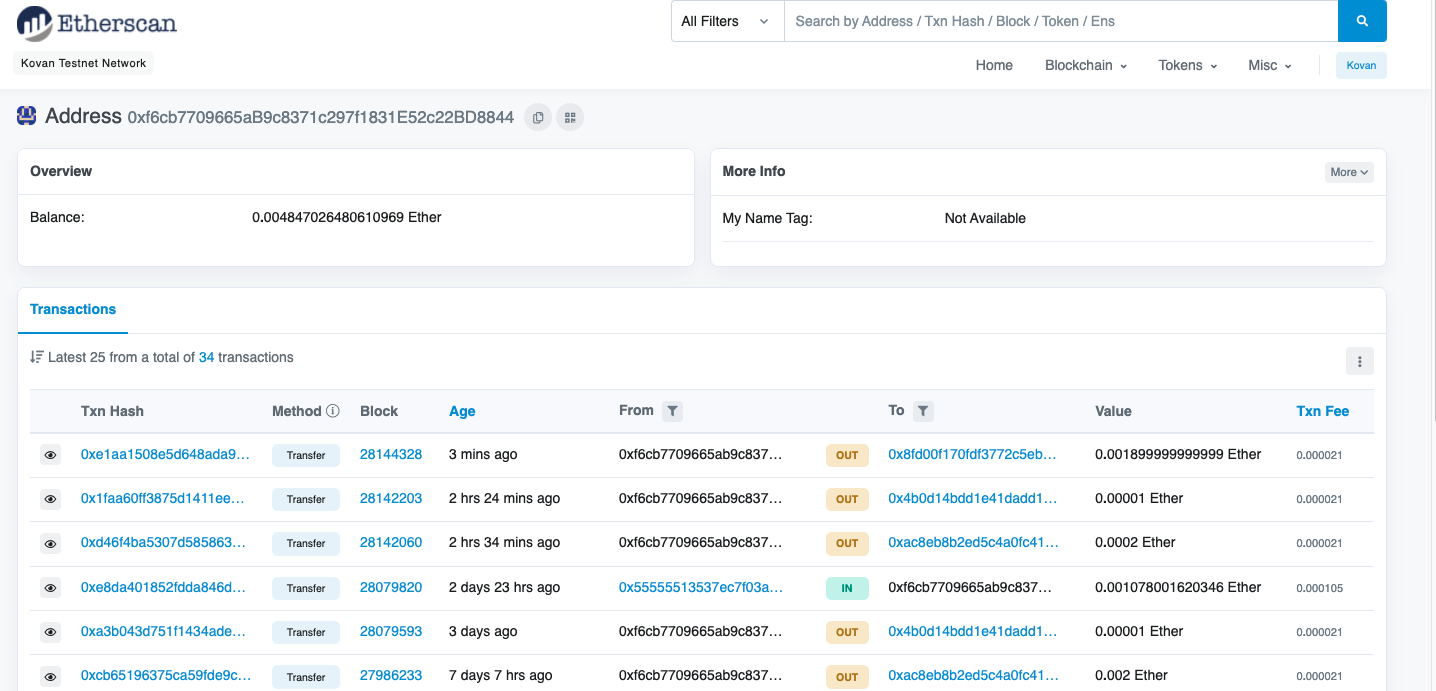 - Check the transaction details by going to https://kovan.etherscan.io/ and inputting the tx hash or either sender or receiver addresses.