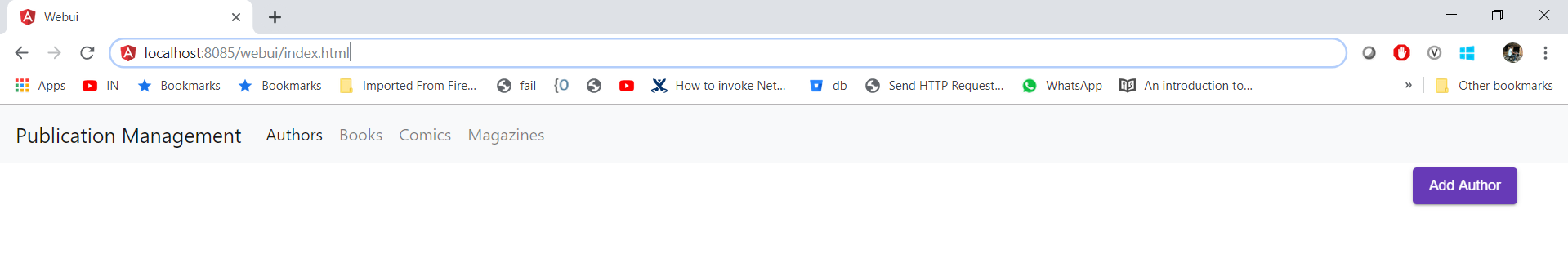 *Angular Web UI project is also bundled with this jar and can be accessed on http://localhost:8085/webui/index.html URI. Listing and addition of book and authors functionality is only working in Web UI developed using angular 7. *