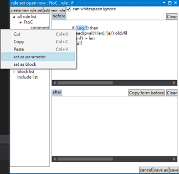 beforeis the rule edit block that before transferred,afteris the rule edit block that after transferred.- Add text : user can enter text directly, or select text in an already opened file, right-click to add it into rule edit block.