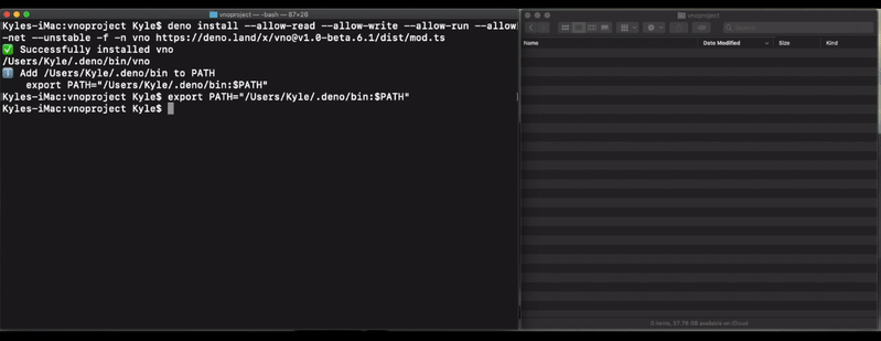 export PATH="/home/<USERNAME>/.deno/bin:$PATHto the end of the file. - Run the following command in your terminal to install vno on your machine.