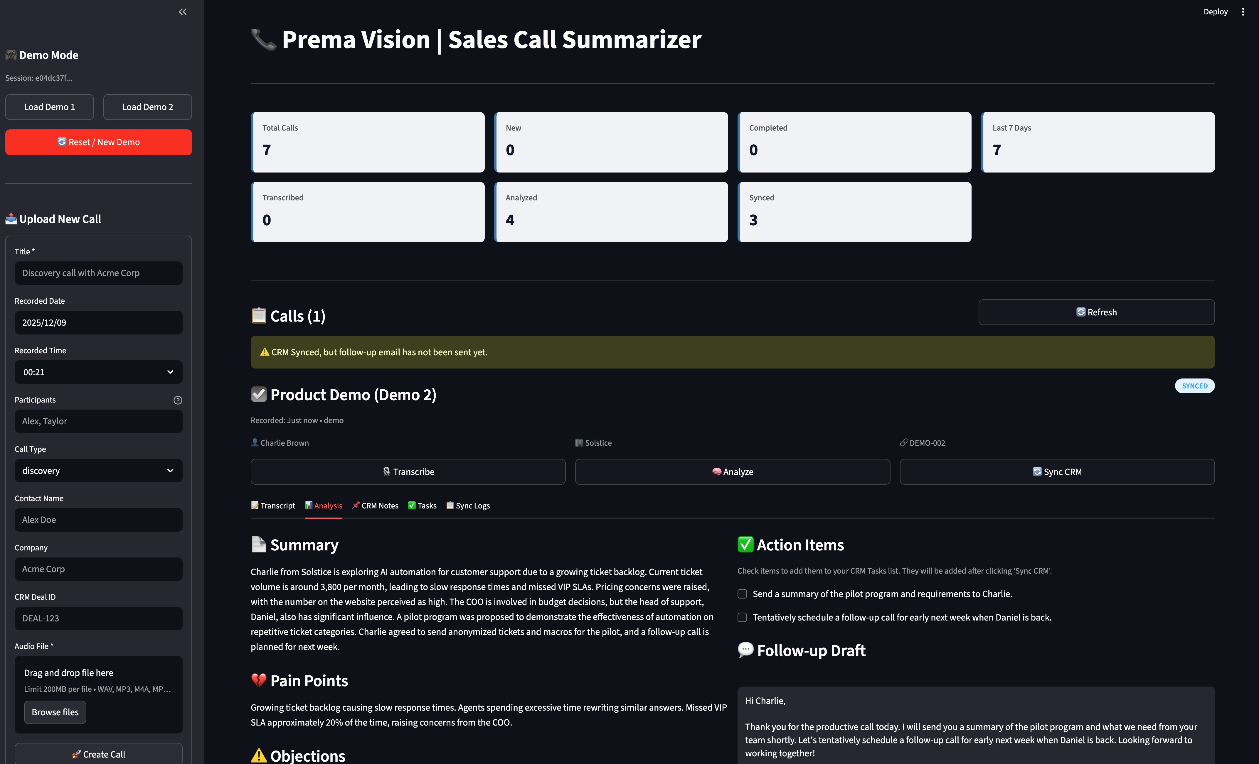 - Sync: Click 🔄 Sync CRM. Data is pushed to the CRM system (simulated in this demo) and the status updates to
