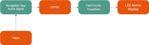The ESP32 microcontroller acts as a receiver for audio signals from popular navigation applications such as Google Maps or Waze, which are transmitted via the onboard Bluetooth module. These incoming audio signals are then processed using a fast Fourier transform (FFT) function to extract the audio frequency information. Once the audio frequency is isolated, the microcontroller uses simple conditional statements in the code to trigger corresponding animations on an LED Matrix display. For instance, if the detected frequency falls within the range of 200-220 Hz, a '3-2-1 GO' animation could be displayed, synchronizing with the navigation application's cues. This approach enables a visually engaging and intuitive way to convey navigation instructions to the user while minimizing the need for distracting audio cues.