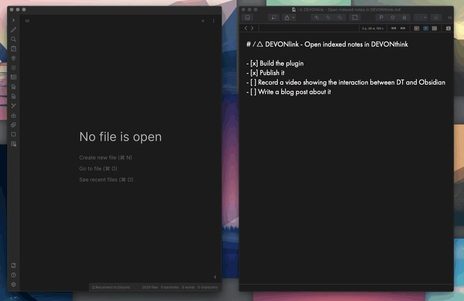 Pair it with the companion AppleScript to integrate Obsidian and DEVONthink notes. Read more about the plugin and find the AppleScript here: https://axle.design/devonlink-integrate-obsidian-and-devonthink