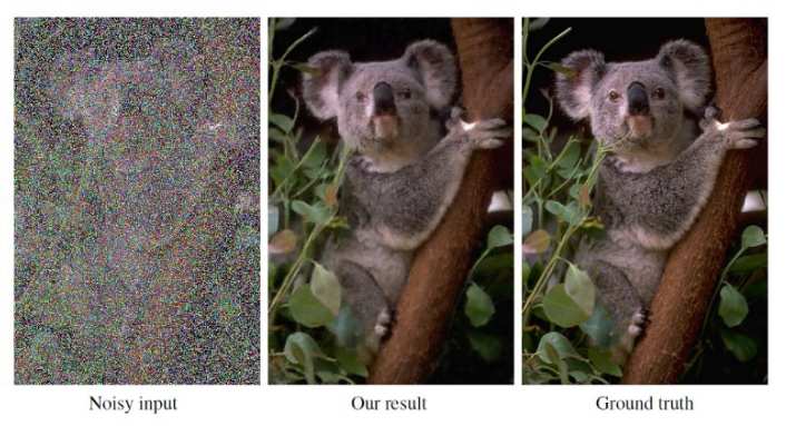 美国科学家公布了一种消除图片噪点的 AI 算法。这种算法可以从有噪点的图片推断出原图。上面第一张图是原图,第二张是算法处理的结果,第三张是没有噪点的实际图像。